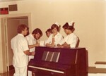 The photograph depicts nursing students socializing near a piano at the 1979 Student Nurses' Association (SNA) banquet. Ironically, one of the students appears to be smoking in front of a no smoking sign.