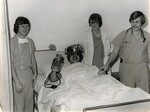 Nursing students, left to right Steve Bracken, Ron Yarborough (SP), Kris Kimble, and Bill Beckner, gather around the bed of Yarborough in order to practice their medical engagement.