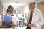 UNA Student Nurse Ms. M. Russell standing with an unnamed doctor in a clinical setting.