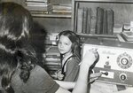 Nursing student administering a hearing test to a school aged child, circa 1970s.