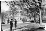 Two students talking in front of Bibb Graves Hall. Notice the cars parked on the side of the building and the red light in the foreground. Streets used to run through campus until it became pedestrian friendly in the early 2000s.