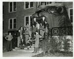Depiction of the 1949 Florence State University winning homecoming decorations. The scene is located in front of Keller Hall with students in the foreground.